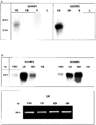 XOMP1 mRNA is visible; in the right blot, expression of XOMP2