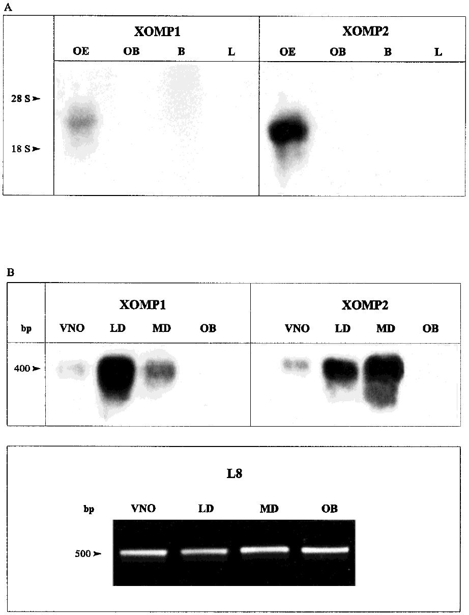 expression of either XOMP1 or XOMP2 is detectable in the olfactory