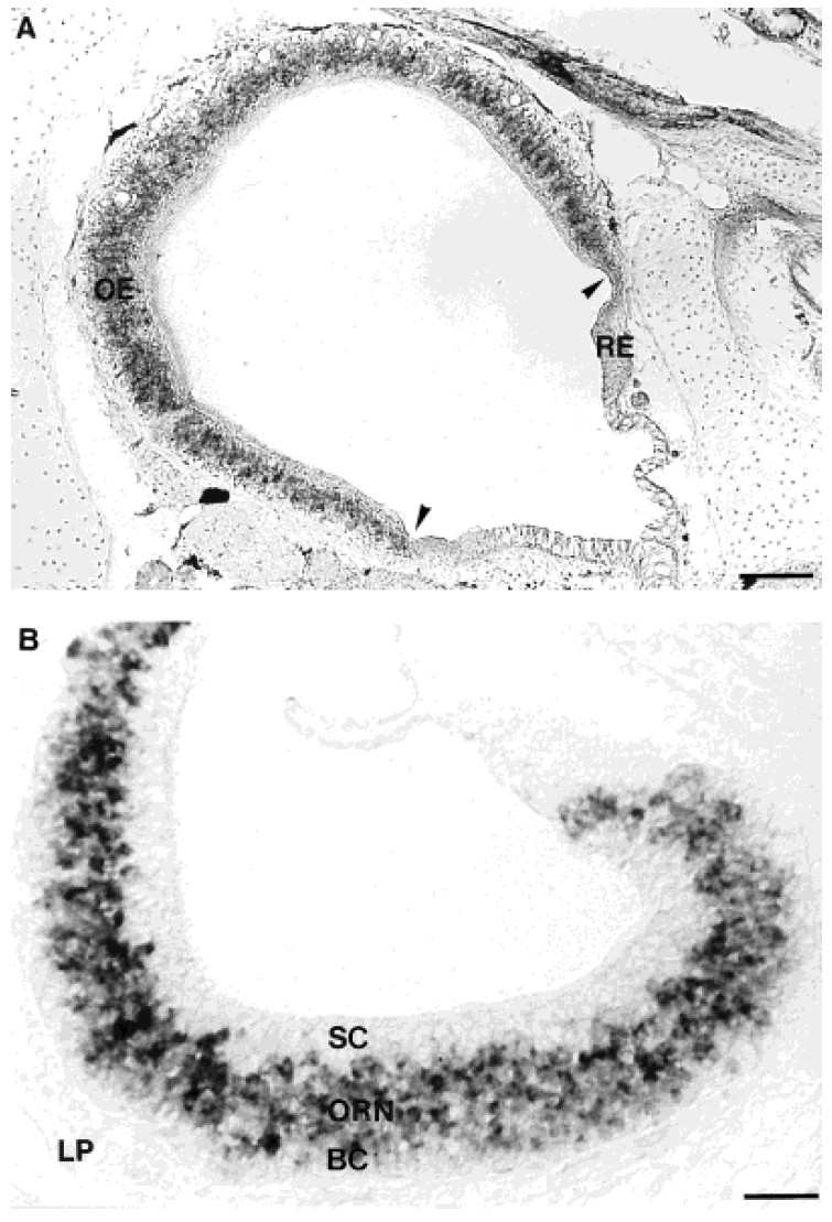 Xenopus olfactory epithelium by in situ hybridization. A: Section