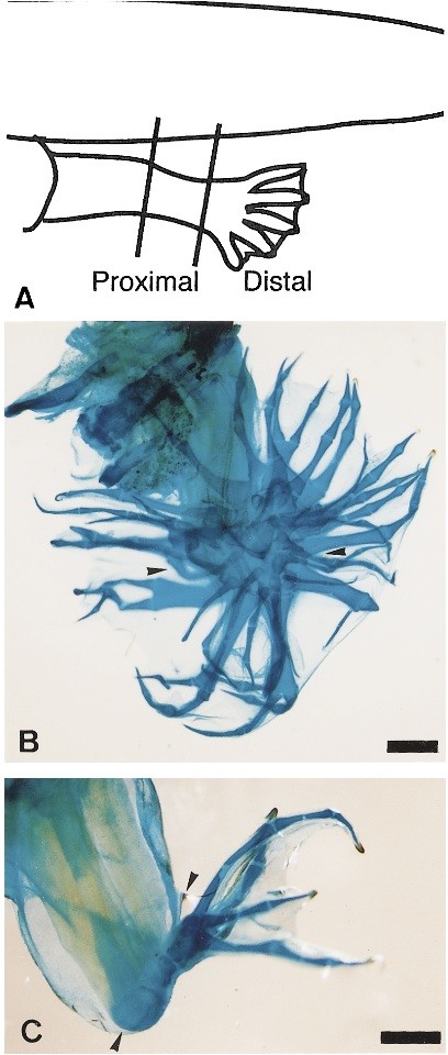 FIG. 4. Digit formation in the recombinants with proximal and distalmesenchyme. (A) Schematic diagram showing the limb bud at stage 556. Solid lines indicate incisions made for the preparation of proximal and distalmesenchyme. (B) Ventral view of the recombinant with multiple digits produced from proximalmesenchyme. (C) Dorsal view of the recombinant produced from the distalmesenchyme. Alcian blue staining. Note that the recombinant from the proximalmesenchyme developed many radially elongated digits, but that from the distal one developed a few digits. Arrowheads show the hostraft boundary. Bars, 1 mm.