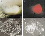 FIG. 2. PKH-26-labeled recombinant limb made from stage 51 mesenchyme. (A and B) Whole-mount preparation of a recombinant limb. (C and D) Cryosection of the same recombinant limb. (A and C) In ordinary light. (B and D) In fluorescent light. 18 days after operation. Small arrows indicate protrusions which later form digits. Note that the protrusion-forming regions are of graft origin. Bars, 250 mm.