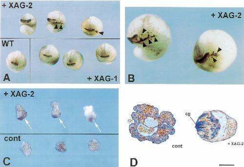 arrowheads. (C) Animal caps injected with XAG-2 RNA develop a morphologically differentiated cement gland (white arrows), while control explants (three