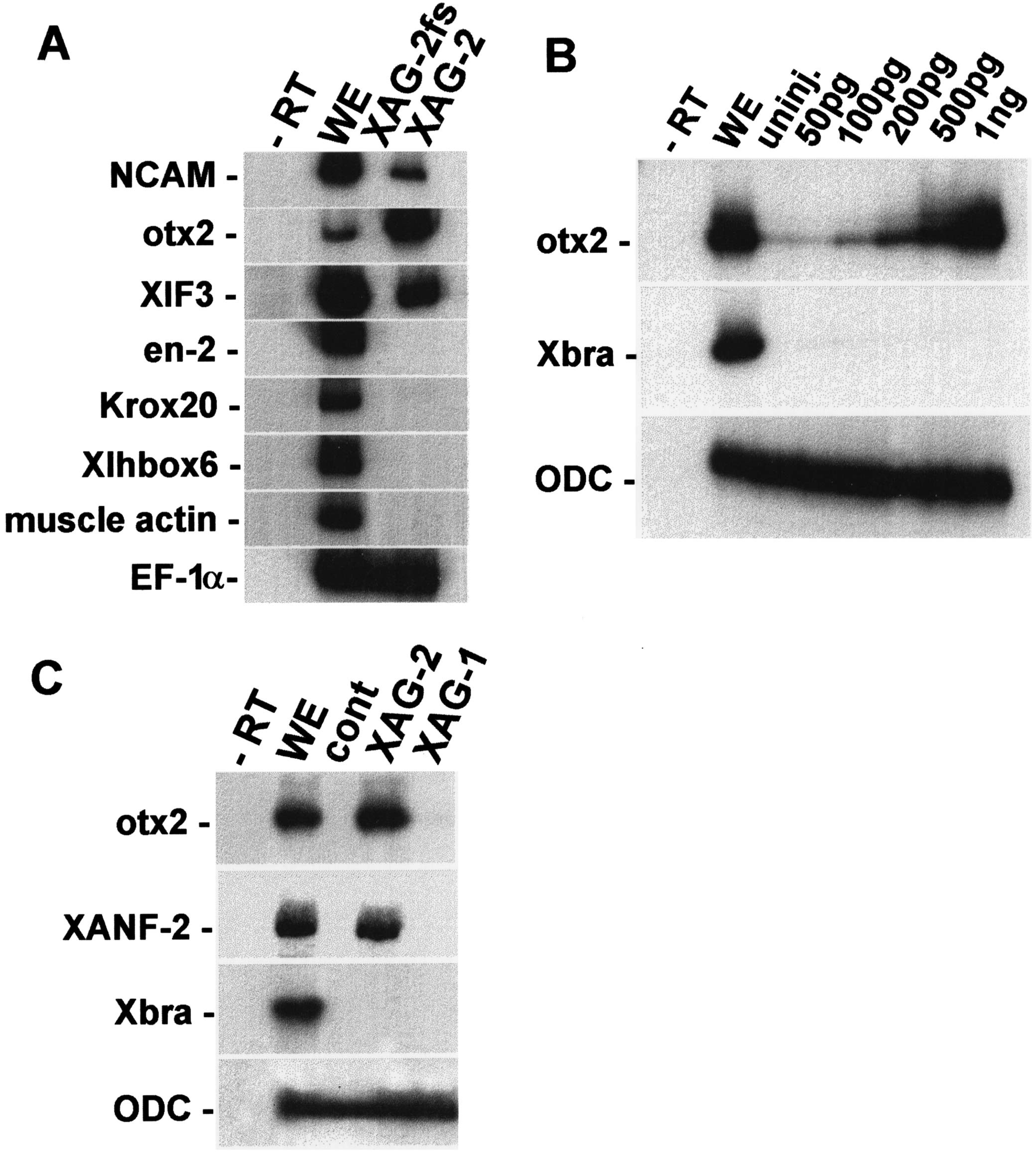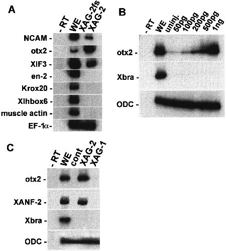 explants isolated either from XAG-2- or XAG-1-injected embryos. Activation of the anterior neural marker genes otx2 and XANF-2 is only observed in