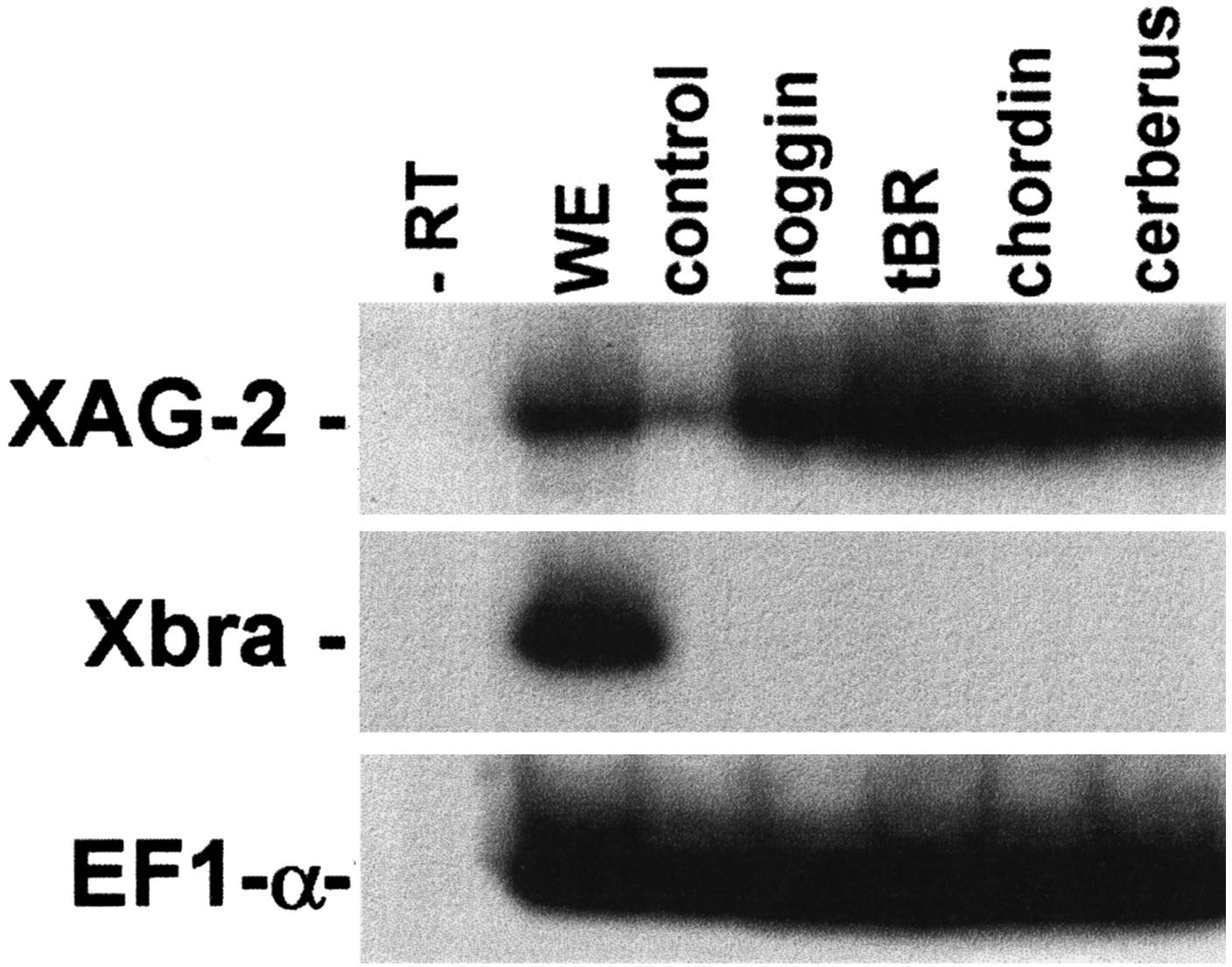 of injected XAG-2 RNA. Lack of Xbra expression in explants indicates that mesoderm was not present in animal caps. (C) RT-PCR analysis of ectodermal