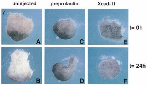 Fig. 7. Convergent extension movement was abolished in explants of the dorsal upper blastopore lips after overexpression of Xcadherin-11. (A,C,E) Explants directly after excision from the embryos. (B,D,F) Corresponding explants after 24 h of in vitro culture. (A,B) Explant of an uninjected control embryo. (C,D) Explant of a control embryo injected with 700 pg preprolactin mRNA. (E,F) Explant of an embryo receiving 700 pg Xcadherin-11 mRNA. Normal convergent extension of the control explants becomes obvious by a constriction and an elongation of the explant in the direction of the former blastopore.