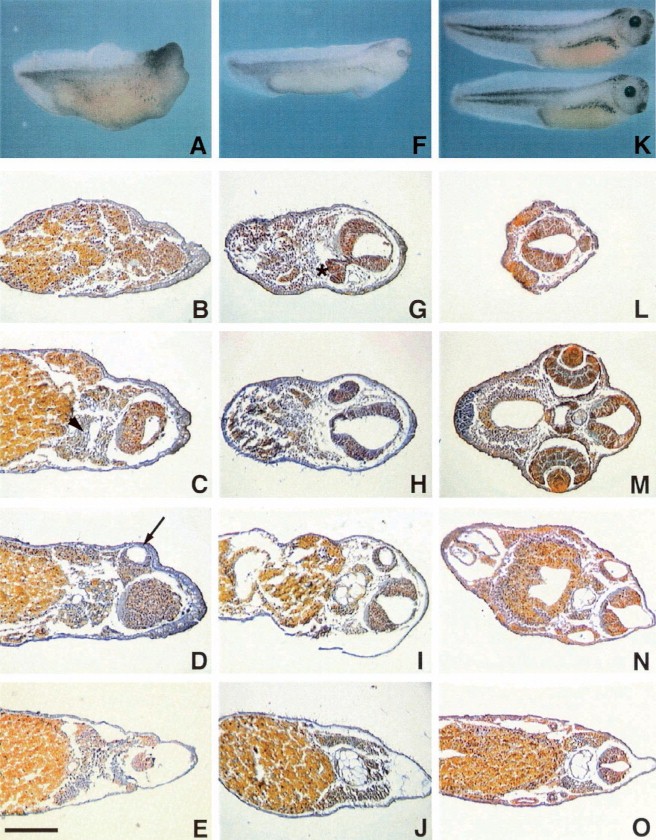 Fig. 5. Posteriorised phenotypes resulting from injection of Xcadherin-11 RNA at the dorsal side showed disorganised mesodermal and neural tissues. Left panel: embryos injected with 700 pg RNA, middle panel: embryos injected with 350 pg RNA, right panel: uninjected control embryo. (A,F,K) Embryos before paraffin embedding and sectioning. (BâO, except F,K) Transverse sections of embryos shown in (A,F,K). Transverse sections through the head region revealing amorphous brain structure (B,C,D), or eye anlage not separated from diencephalon (G, asterisk), fused somites (C, arrowhead), otic vesicle atypically thickened by neural tissue (D, arrow), missing notochord (C,D, arrowhead) or enlarged notochords (I,J). Transverse sections of the trunk region revealed very small neural tubes (E,J). Bar: 200 mm.