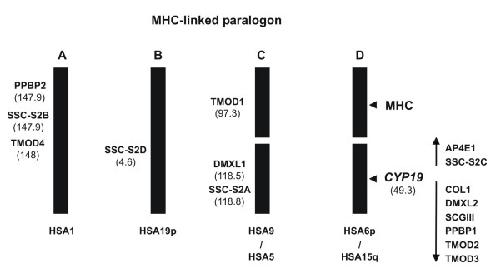 Figure 1. The MHC-paralogon. Two sets of paralogy regions are intact (A and B) while the remaining 2 are broken (C and D) (adapted from [20]). The map location of the MHC, CYP19 and the surrounding genes (and paralogues) is shown. In parentheses the genomic distance in megabases to the p telomere.
