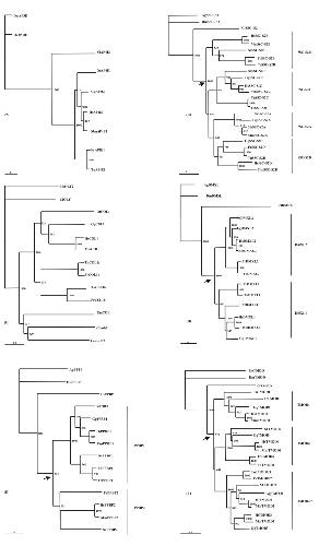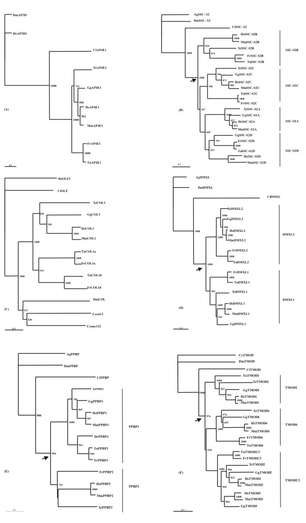 Figure 3. Neighbor-joining phylogenetic trees from alignment of the putative protein sequences of AP4E1 (A), SSC-2S (B), COL (C), DMXL (D), PPBP (E) and TMOD (F). Figures at nodes are scores from 1000 bootstrap resamplings of the data. Arrow denotes duplication timing. Ag – Anopheles gambiae; Ce – Caenorhabditis elegans; Dm – Drosophila melanogaster; Ci – Ciona intestinalis; Hs – Homo sapeins; Mm – Mus musculus; Gg – Gallus gallus; Xt – Xenopus tropicalis; Fr – Fugu rubripes; Tn – Tetraodon nigroviridis.