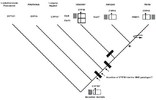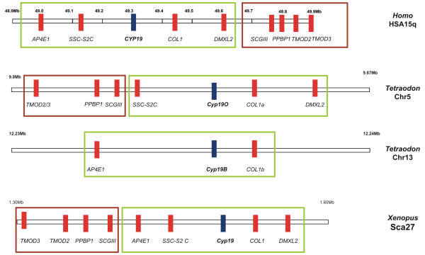 Figure 2. Physical maps of the genomic environment around CYP19 in Homo sapiens, Tetraodon nigroviridis and Xenopus tropicalis.