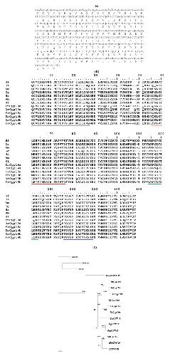 Figure 5. Nucleotide and predicted amino acid sequence of the AmphiCYP19 (partial sequence) (A); alignment of CYP19 sequences; dashes denote insertions; black line, I-helix region; red line, Ozol's peptide region; green line, Aromatic region and blue line, Heme binding region. Bf, B. floridae, Ds, D. sabina, Am, Alligator mississippiensis, Gg, G. Gallus, Hs, H. sapiens, Mm, M. musculus, Xt, X. tropicalis, Tn, T. nigroviridis, Dr, D. rerio, Fr, Fugu rubripes (B); Neighbor-joining phylogenetic tree from the alignment of the putative protein sequences of CYP19 genes, figures at nodes are scores from 1000 bootstrap resamplings of the data ; an insertion of the TnCYP19b predicted protein sequence was kept out of the alignment (C).