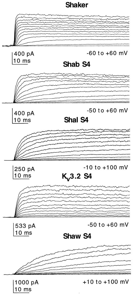Charged residues in the S4 transmembrane segment of voltage-gated cation channels play a key role in opening channels in response to changes in voltage across the cell membrane. However, the molecular mechanism of channel activation is not well understood. To learn more about the role of the S4 in channel gating, we constructed chimeras in which S4 segments from several divergent potassium channels, Shab, Shal, Shaw, and Kv3.2, were inserted into a Shaker potassium channel background. These S4 donor channels have distinctly different voltage-dependent gating properties and S4 amino acid sequences. None of the S4 chimeras have the gating behavior of their respective S4 donor channels. The conductance-voltage relations of all S4 chimeras are shifted to more positive voltages and the slopes are decreased. There is no consistent correlation between the nominal charge content of the S4 and the slope of the conductance-voltage relation, suggesting that the mutations introduced by the S4 chimeras may alter cooperative interactions in the gating process. We compared the gating behavior of the Shaw S4 chimera with its parent channels, Shaker and Shaw, in detail. The Shaw S4 substitution alters activation gating profoundly without introducing obvious changes in other channel functions. Analysis of the voltage-dependent gating kinetics suggests that the dominant effect of the Shaw S4 substitution is to alter a single cooperative transition late in the activation pathway, making it rate limiting. This interpretation is supported further by studies of channels assembled from tandem heterodimer constructs with both Shaker and Shaw S4 subunits. Activation gating in the heterodimer channels can be predicted from the properties of the homotetrameric channels only if it is assumed that the mutations alter a cooperative transition in the activation pathway rather than independent transitions.
