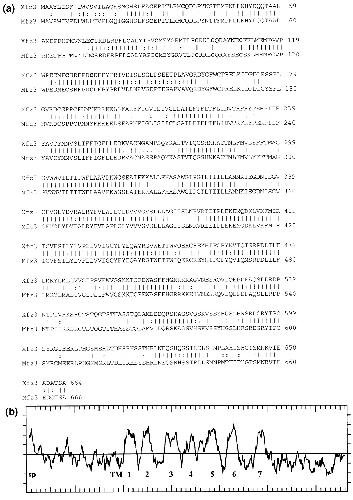 signal peptide (sp) and the seven transmembrane segments (TM 1–7) indicated. The nucleotide sequence has been deposited to the EMBL database (access