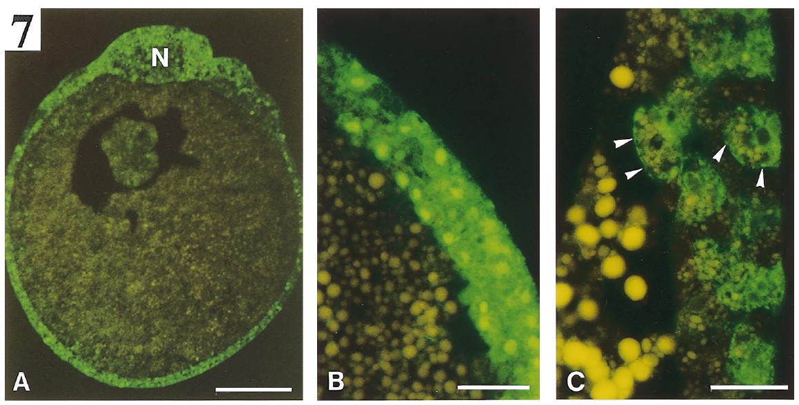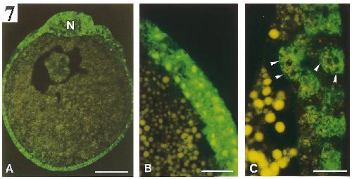 Fig. 7. Lineage of injected cells and localization of overexpressed proteins on the cell surface. (A) Transverse section of an embryo injected with 1 ng GFP