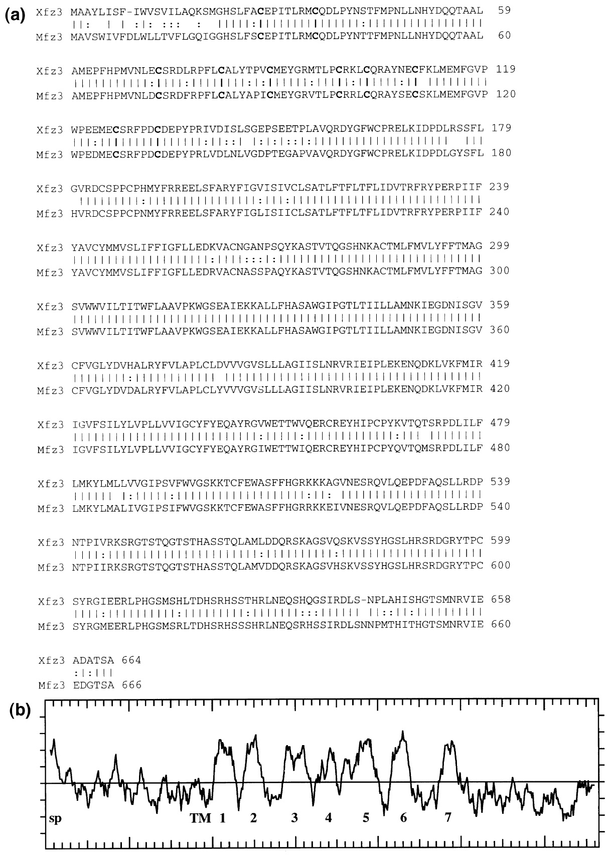 Fig. 1. (A) Protein sequence alignment between Xfz3 and Mfz3. Identical amino acid residues are indicated by vertical lines. The ten invariant cysteines are