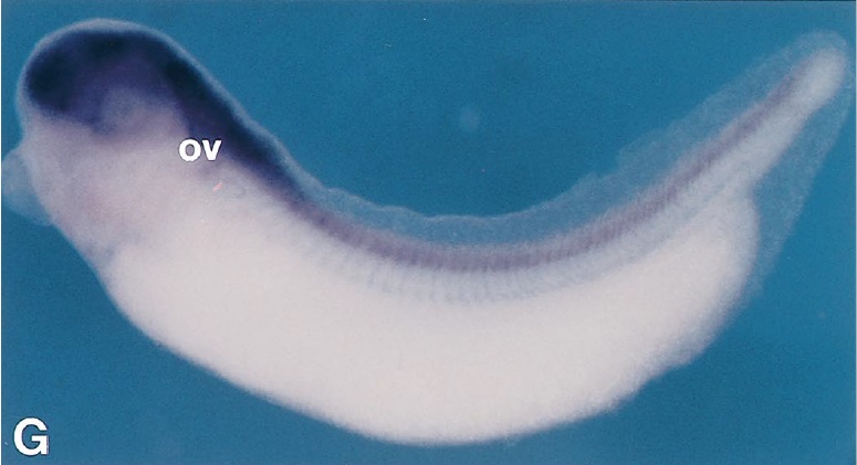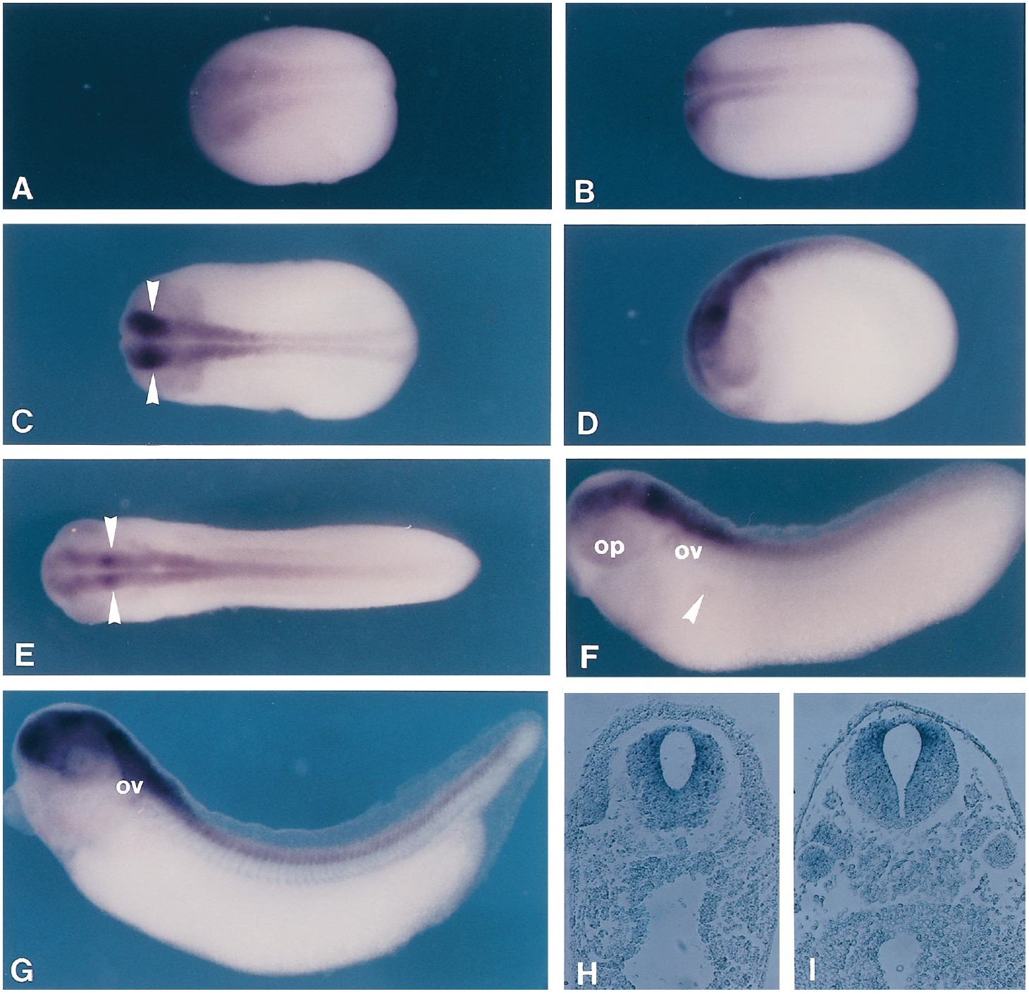 in the pronephros anlage (arrowhead). (G) Stage 35, lateral view. Xfz3 mRNA is strongly expressed in the anterior nervous system. Lower levels of