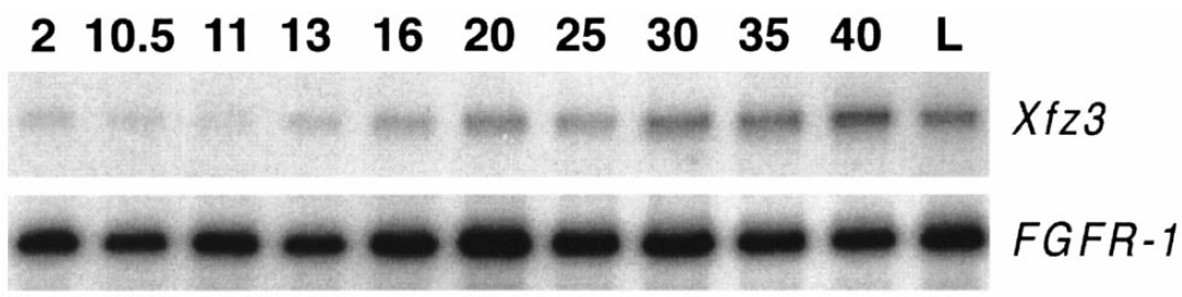 protection. The level of expression is low at cleavage and gastrula stages and increases significantly at neurulation. FGFR-1 probe was used as a loading