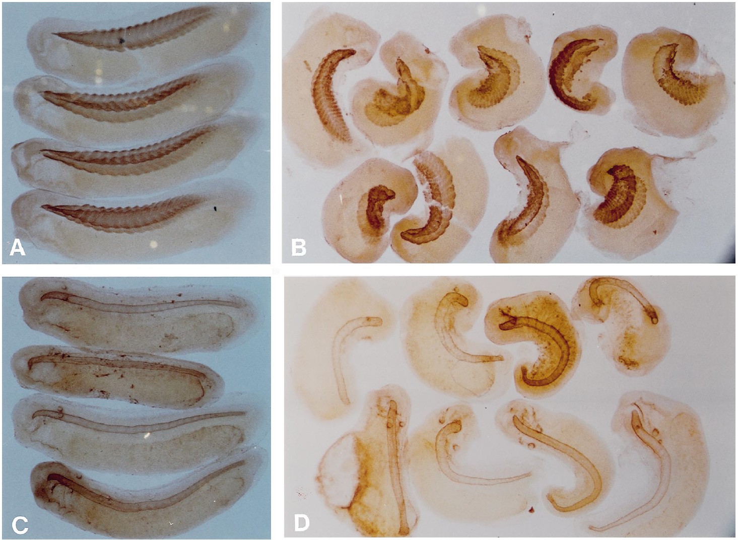 Fig. 5. Whole-mount immunocytochemistry for somites (A,B) and notochord (C,D). All embryos were fixed at stage 30. (A,C) Normal embryos. (B,D)