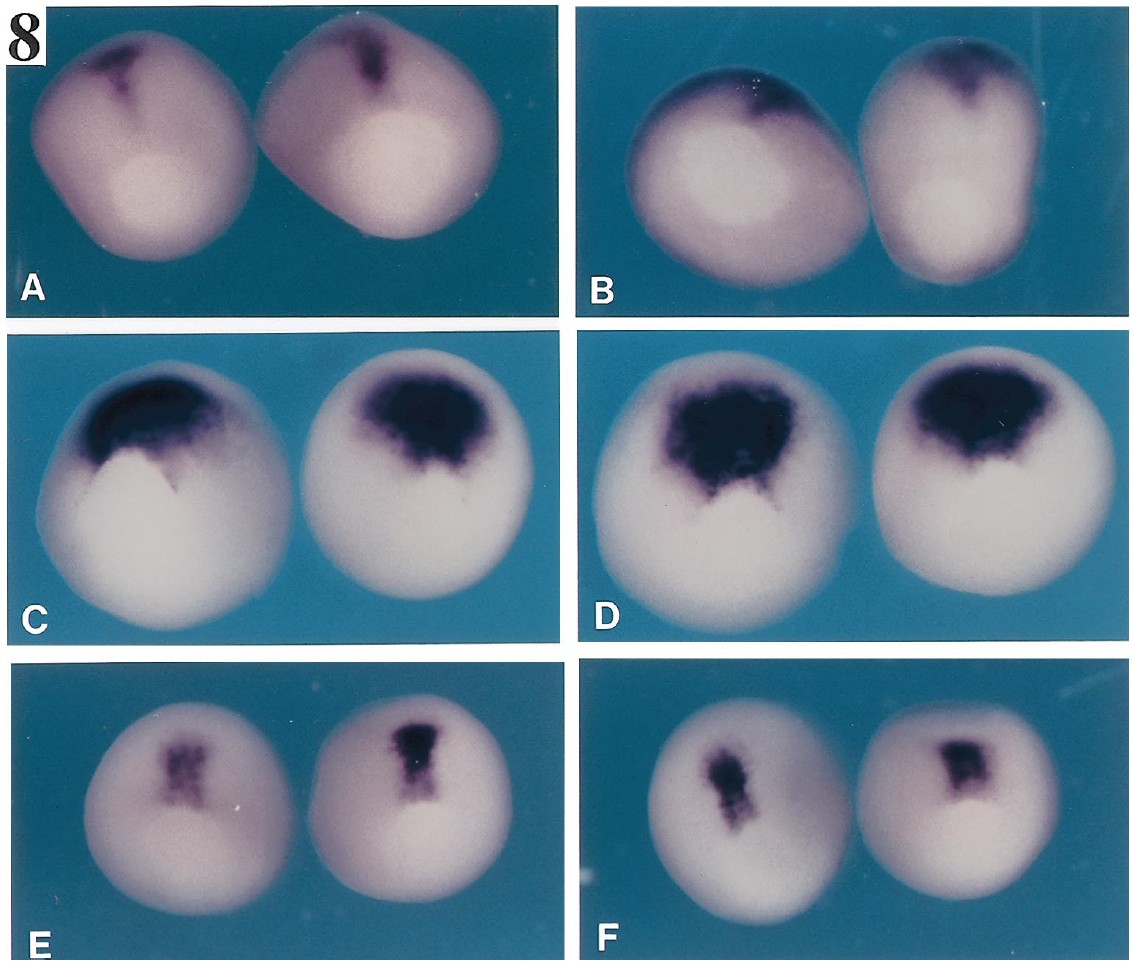Normal embryos. (B,D,F) Embryos injected with 0.25 ng Xfz3 RNA near the animal pole region. (A, B) Expression of goosecoid in normal (A) and injected