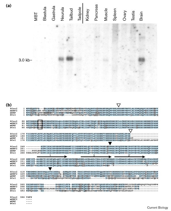 Figure 1. (a) A profile of Xcoe2 transcript accumulation during development and in adult tissues. A northern blot containing RNA from different developmental stages was probed with labelled 2.2 kb Xcoe2 cDNA. The developmental stage of each embryonic RNA is indicated. No hybridisation signal was detected with RNA from oocytes at any stage of oogenesis (data not shown). A 3 kb Xcoe2 transcript is present in embryos starting at the neural plate stage. A transcript of the same size is detected in specific adult tissues and is most abundant in muscle, testis and brain. Each lane contains 10 μg total RNA. We used ribosomal RNA, visualised by ethidium bromide staining, as an internal standard for quantification of deposited RNA (data not shown). MBT, mid-blastula transition. (b) Amino-acid sequence alignment of Xenopus XCoe2 with other members of the EBF/Col family; mouse EBF and EBF2 and Drosophila Col. Identical and similar amino acids are indicated by blue and grey shading, respectively. The DNA-binding domain, framed by open arrowheads, extends from EBF/Olf-1 amino acids 50 to 251 and includes a zinc-binding motif (amino acids 15177). The second highly conserved domain is framed by black arrowheads. The horizontal arrows indicate the positions of helix 1 and helix 2 of a predicted HLH motif which is conserved in all four proteins; a duplicated helix 2 (labelled 2′) is present in the vertebrate proteins. A stretch of two ro three amino acids specific to each protein is boxed. Dashes represent spaces to optimise the alignment. |