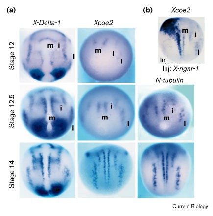 Figure 3. X-Dl1, Xcoe2 and N-tubulin are activated sequentially in prospective primary neurons. (a) Expression of X-Dl1, Xcoe2 and N-tubulin during early Xenopus embryogenesis was analysed by whole-mount in situ hybridisation. Probes and stages of embryonic development are indicated. All embryos are shown in a dorsal view, with the anterior to the top. The three stripes of primary neurons, medial (m), intermediate (i) and lateral (l), are indicated. (b) One cell (inj) of an embryo at the two-cell stage was injected with synthetic X-ngnr-1 (10 pg) and lacZ (50 pg) mRNAs. In situ hybridisation to a stage 14 embryo with a probe to Xcoe2 shows the ectopic activation of Xcoe2 by X-Ngnr-1. |