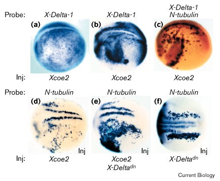 Figure 6. Xcoe2 ectopically activates, and is regulated by, lateral inhibition. One cell of a Xenopus embryo at the two-cell or four-cell stage was injected with (a)XCoe2 (400 pg) and lacZ (50 pg) mRNAs; a combination of (e)XCoe2 (10 pg), X-Dl1dn (400 pg) and lacZ (50 pg) mRNAs; or (f)X-Dl1dn (400 pg) and lacZ (50 pg) mRNAs, as indicated. Injected embryos at (a) stage 12.5, (b,c) stage 17 or (d) stage 13.54 were hybridised with (a,b) X-Dl1 probe, (c) a combination of X-Dl1 and N-tubulin probes or (d) N-tubulin probe alone as indicated. (a) Lateral view, the injected side is shown. (d) Dorso-lateral view, the injected side is indicated (inj). Ectopic X-Dl1 expression is fairly uniform at stage 12.5 on the injected side, inj (a), and concentrates in patches of cells at stage 17 (b). At stage 17 (c), ectopic N-tubulin expression (dark blue staining) occurs specifically at the periphery of X-Dl1 positive patches (red staining). |