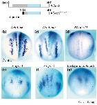 Figure 5. Induction of ectopic neurogenesis by injection of Xcoe2 mRNA. Ectopic neurogenesis was visualised by whole-mount in situ hybridisation using either (a,c)XNeuroD or (b)X-ngnr-1 probes on embryos at (a,b) stage 15 and (c) stage 25 or (d,e) immunostaining stage 30 embryos with anti-N-CAM antibodies. Embryos were microinjected with Xcoe2 (400 pg) and lacZ (50 pg) mRNAs on one side (inj), and the other side was used as a control. An enlargement of the box in (d) is shown in (e). |