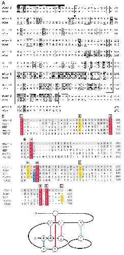 in some members. Note that mCer-1 and Xcer have additional cysteines a–c, but not d. Another cysteine (blue), used for dimerisation in