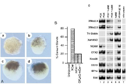 animal caps (stage 35) after mock injection (a) or injection of mRNAs encoding mCer-1 (b), CFLAGâmCer-1 (c), or Xcer (d). A single