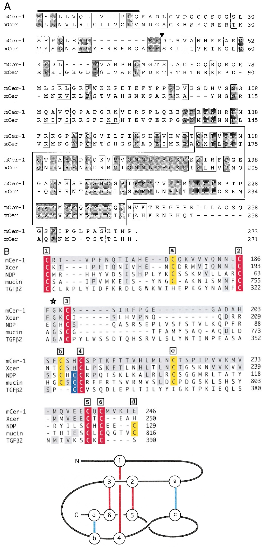 similarities (see Materials and Methods) shown within open boxes. The putative cystine knot domains of mCer-1 and Xcer are outlined.
