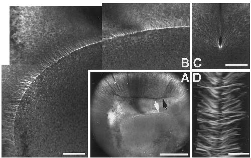 of first cleavage furrow; (D) stage 8 midbodies. Bar 50 um. |