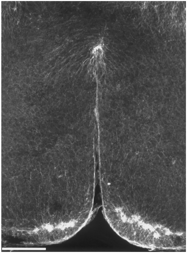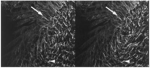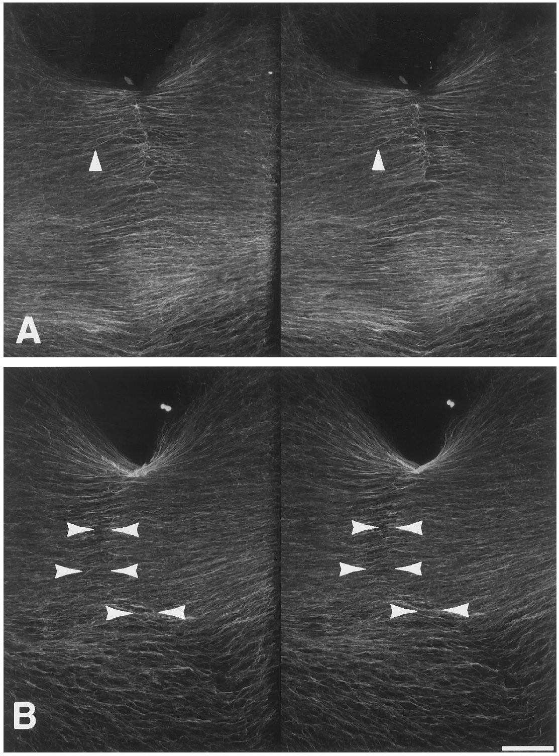 FIG. 1. Microtubule bundles in cleavage furrow. Whole-mount confocal scanning microscope views of the cytoplasmic bridge during