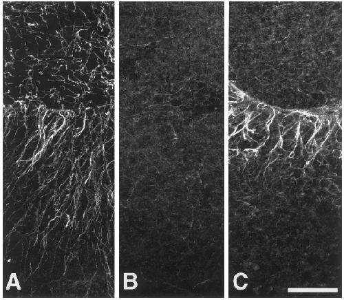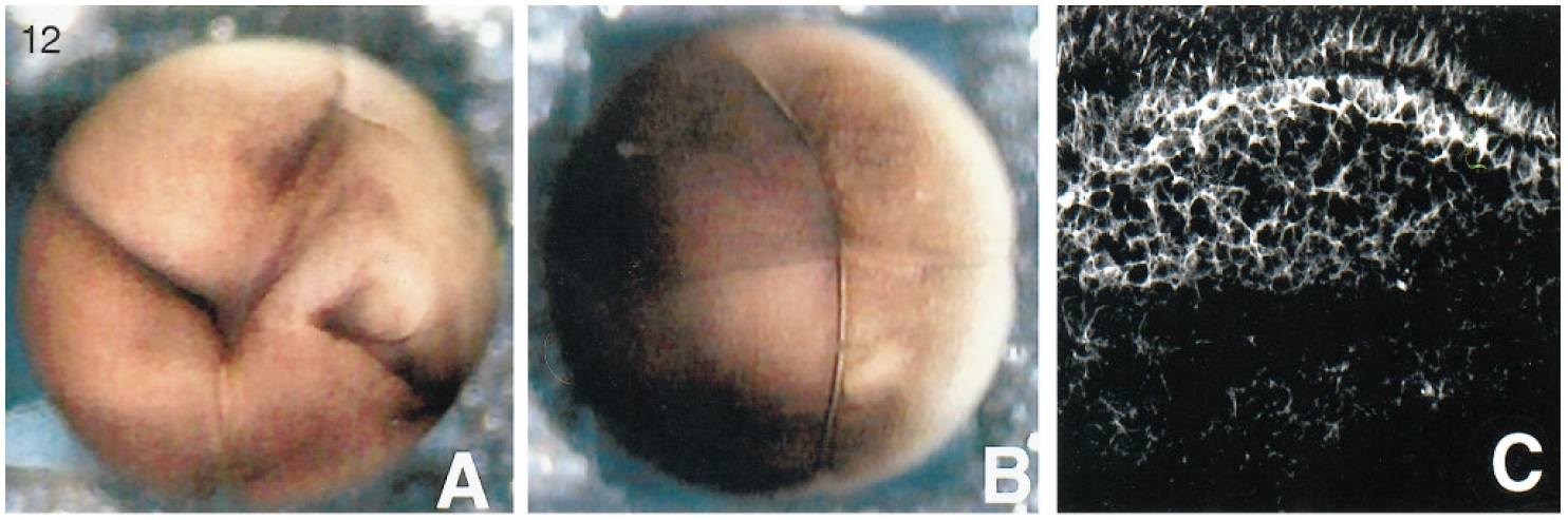 FIG. 14. Whole-mount preparations stained with anti-acetylated tubulin antibody 6-11B-1. (A) 5, (B) 20, and (C) 25 min after appearance