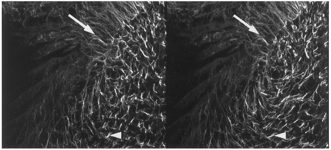 FIG. 6. Stereo pair showing microtubule distribution in cortex underlying stress folds near the advancing edge of the first furrow, about