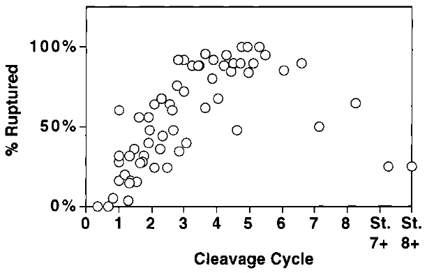 FIG. 10. Cleavage-dependent sensitivity to cold shock-induced rupture. Groups of 20 to 25 embryos were abruptly chilled by immersion in 47CMMR/3 for 4min, quickly returned to room temperature, and scored 2 min later for evidence of rupture along new cleavage furrows as described under Materials and Methods. |