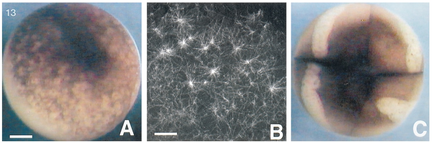 Monasters are abundant in the cytoplasm of eggs treated with 50% D2O before first cleavage. Bar 30 mm. (C) Egg treated late in the