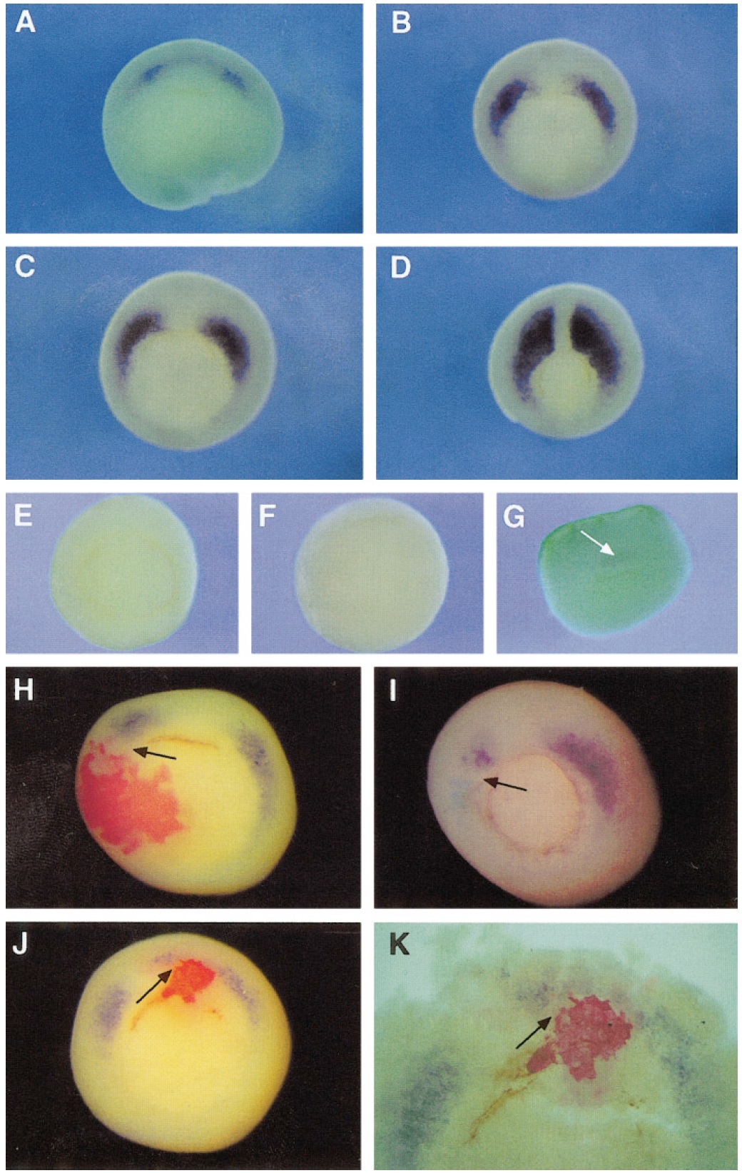over the dorsal blastopore lip. (H and I) Clones of cells expressing BMP-4 within the lateral marginal zone (marked red in H and light