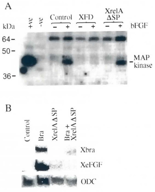 In this report, we have used mRNA injection to study the action of mutants of XrelA, a Xenopus homolog of the RelA (p65) component of NF-kappaB, on the induction of mesoderm in Xenopus embryos. A region of the rel homology domain of XrelA was deleted to create XrelA deltaSP, which retains the dimerization and activation domains, but no longer binds to DNA. We also made an analogous derivative of mammalian NF-kappaB1 (p50). We show that both constructs have dominant inhibitory activity. When message encoding either is injected into eggs or oocytes, DNA binding of rel family members is suppressed, as is transactivation of a kappaB-dependent promoter in embryos. Expression of XrelA deltaSP in animal caps blocks the induction of mesoderm by bFGF. In addition, this mutant prevents elongation movements generated by activin, but has little effect on posterior dorsal cytodifferentiation, which in marked contrast is blocked by inhibition of the FGF signal transduction pathway between the receptor and MAP kinase. The specificity of the XrelA deltaSP effect on FGF signaling is shown by rescue of mesodermal marker expression when XrelA deltaSP is co-expressed with a specific rel inhibitor. The target of these dominant negative constructs seems to be neither XrelA itself, nor p50, but rather some other molecule with which XrelA, rather than NF-kappaB1, heterodimerizes. We show that XrelA deltaSP blocks FGF induction of mesoderm downstream of MAP kinase and Xbra expression. Thus it prevents the maintenance of Xbra expression by inhibiting its autoregulation by embryonic FGF (eFGF). We suggest that XrelA deltaSP differs from other reported inhibitors of FGF signaling because it inhibits only gastrula stage FGF signaling and not the maternally programmed signaling at the blastula stage. Our results therefore suggest that zygotic FGF action is required for cell movements rather than dorsal differentiation.