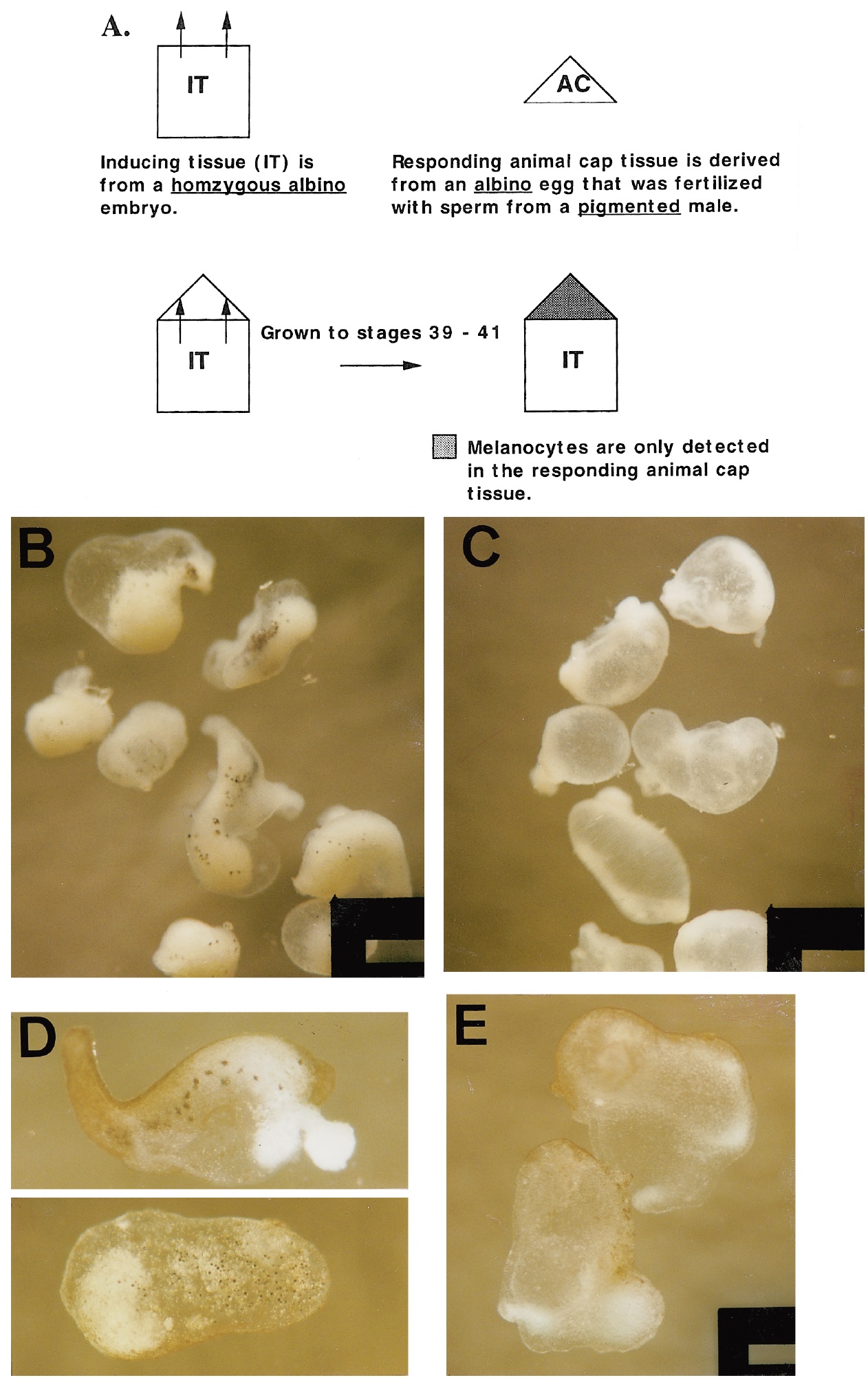 of induction. The use of heterozygous albino or lightly pigmented ACs enables easy visualization of black melanocytes on a light