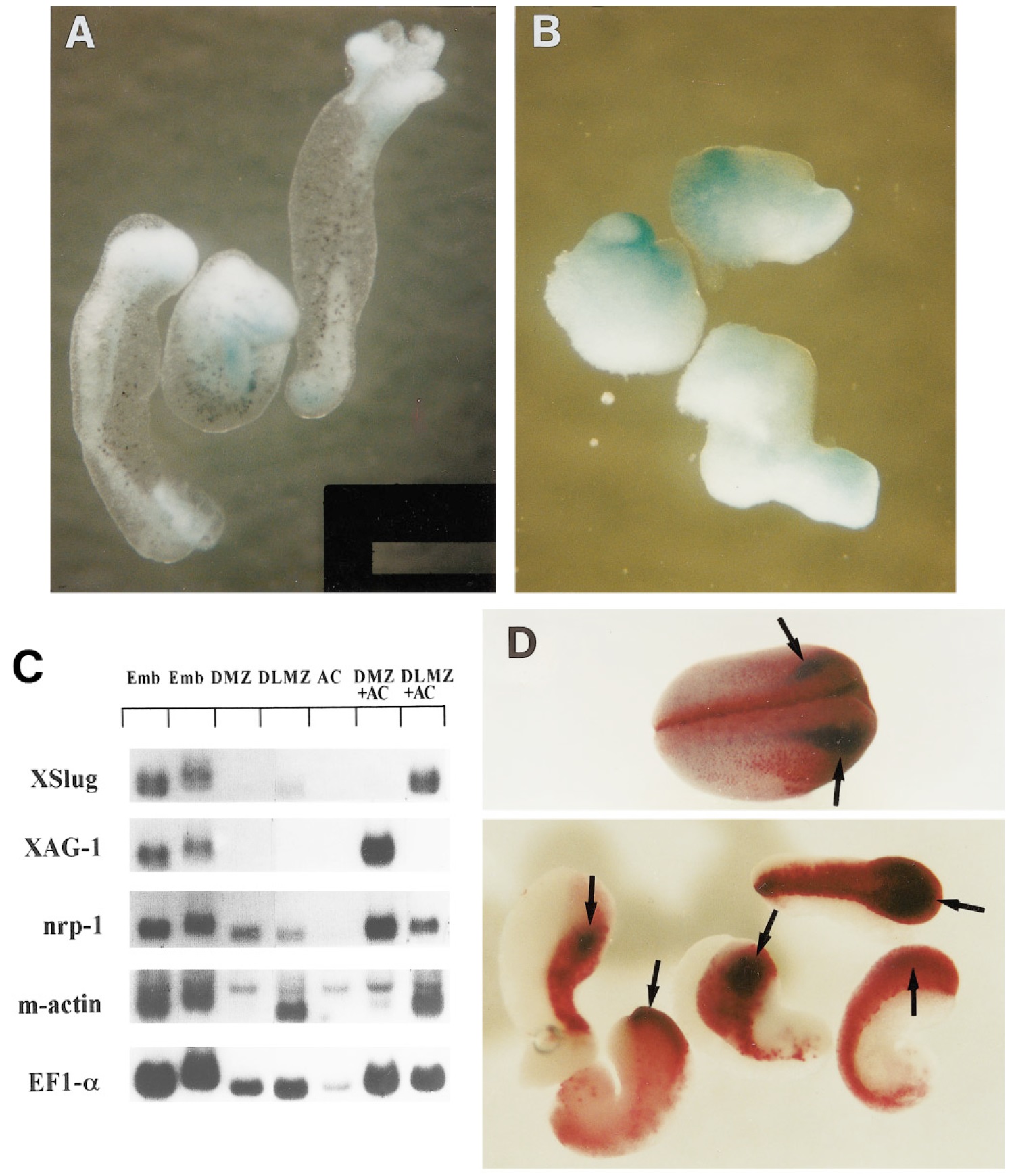 band; the upper band is cross-hybridization to cytoskeletal actin. (D) Whole-mount in situ hybridization with XSlug was performed on