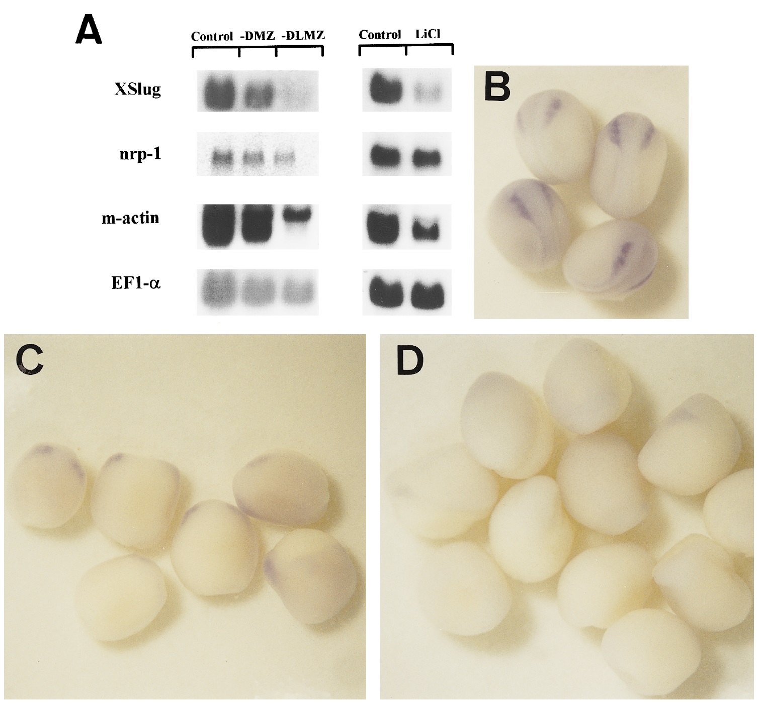 FIG. 5. Expression of XSlug in embryos lacking paraxial or axial mesoderm. (A) Northern analysis of RNA isolated from stage 17 embryos. Total RNA was isolated from 4 control, -DMZ, or -DLMZ embryos and from 10 control or LiCl-hyperdorsalized embryos. Two embryo equivalents of RNA were loaded per well for Northern analysis. Filters were sequentially hybridized with Xenopus cDNA probes for XSlug, nrp-1, muscle-specific actin (m-actin), and EF1a. (B) Whole-mount in situ hybridization with XSlug was performed on mid-neurula stage embryos (see Materials and Methods), dorsal view. (C) XSlug expression in mid-neurula-stage embryos (-DMZ), dorsal view. (D) XSlug expression in mid-neurula-stage embryos (-DLMZ), dorsal view.