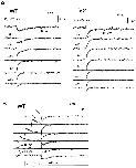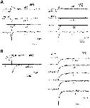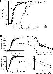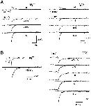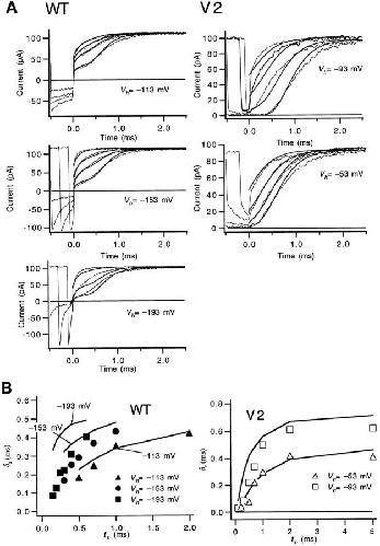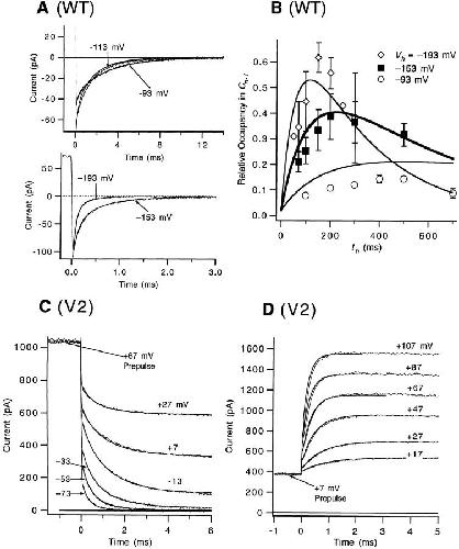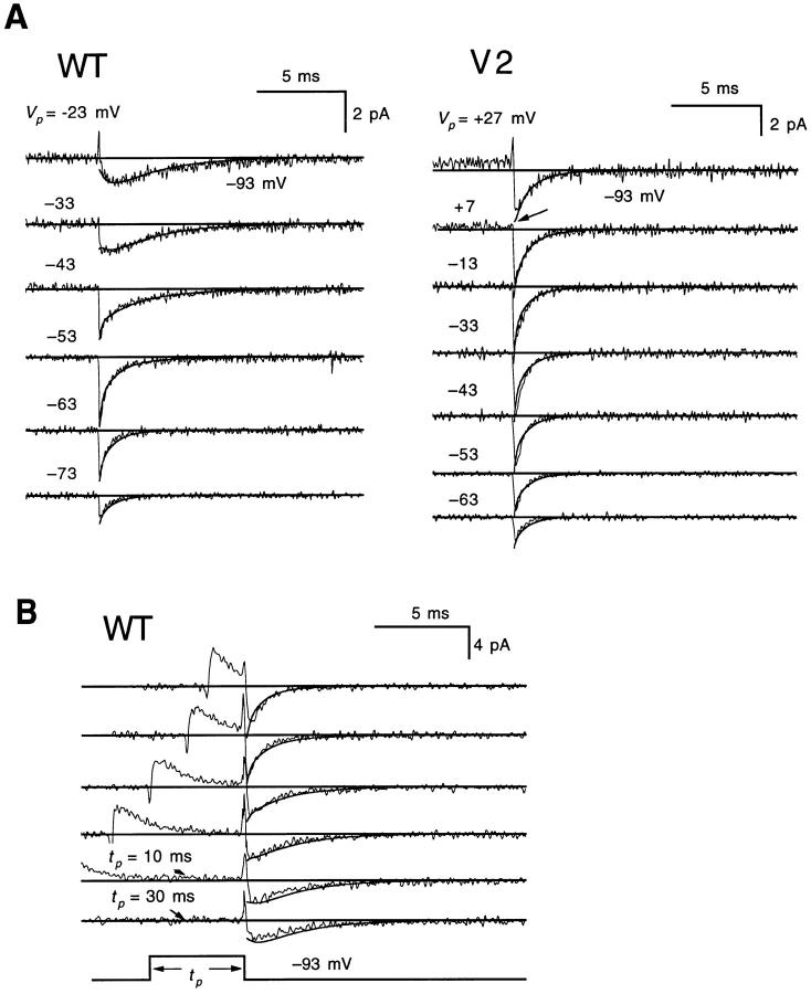 Figure 19. Fits of Scheme 3+2′ to WT's and V2's off gating currents after a range of prepulses of different amplitude Vp (A) and different duration tp (B). In B, WT's currents were measured after different prepulses to −33 mV that ranged in duration from 30 to 2 ms (bottom to top). The test voltage for all recordings was −93 mV. For WT's currents, the model accounts for the development of a slowly decaying off current with an increase in the amplitude or duration of the prepulse. The model also accounts for V2's faster off current decay kinetics. The arrow on V2's off current after a prepulse to +27 mV in A marks a small inflection in the simulated current that corresponds to a plateau phase. Data from patches w212 and v219 in A, and patch w217 in B. |