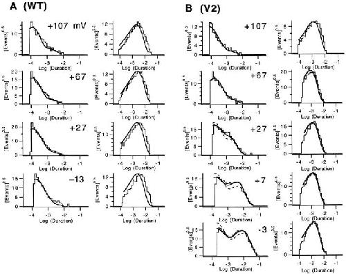 Figure 4. Fits of Scheme 0+2′ to the single-channel closed and open dwell-time histograms at depolarized voltages for WT (A) and V2 (B). For each channel, the closed time histograms are shown on the left, and open times on the right. Solid curves reflect the predictions of Scheme 0+2′ with the values in Table I. The dashed curves on V2's histograms were computed with parameters that are modified from those in Table I in the following way: βN-1(0) was set to 4,400 s−1 and the value αN-1(0) = 300 s−1 was chosen to best fit the closed time histograms. The solid and dashed curves are not always distinguishable. All data are from the same two patches (w265 and v433), except at +107 mV (w266 and v344). |