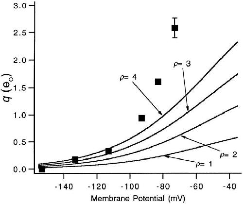 Figure 6. The magnitude of the average, absolute charge movement per channel at negative voltages was used to test the “n4” scheme as a model of the first gating transitions. The solid curves were computed from a model assuming a number p of equivalently acting subunits, for which the charge movement q is given by For each curve the charge z1 and midpoint voltage V1 for the transition were fixed to 0.89 and −53 mV, which are the charge and midpoint voltage values of the very first gating transition derived from the kinetic estimates of α1 and β1. The displayed charge values reflect the same data as in Fig. 1 in Schoppa and Sigworth (1998a), except scaled by the estimate of the single channel charge movement q = 12.3 e0 reported in Schoppa et al. (1992). The error bars are smaller than the symbols for most of the values. |