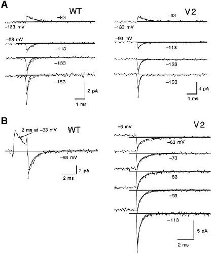Figure 15. Scheme 3+2′ accounts for WT and V2's gating currents at most hyperpolarized voltages. Simulations are shown for (A) currents induced by voltage steps between −93 mV and more negative voltages, and (B) currents induced by step hyperpolarizations from intermediate prepulse voltages. Data are identical to the traces in Fig. 9. For the most negative test voltage in A (−153 mV), Scheme 3+2′ predicts a current that decays too rapidly, by roughly a factor of 2. This discrepancy reflects the 20% increase in qb1 that was introduced to help achieve a sufficiently large total gating charge (see text). |