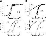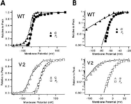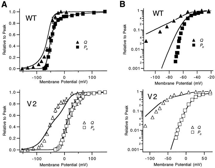 Figure 17. Scheme 3+2′ performs much better than Scheme 2+2′ at predicting certain features of WT's and V2's equilibrium voltage dependence of channel opening and charge movement, including the steepness of V2's Q-V relation and the voltage sensitivity of WT's Po at low Po. As in Fig. 11, plots are shown with ordinates that are linear (A) or log transformed (B). |
