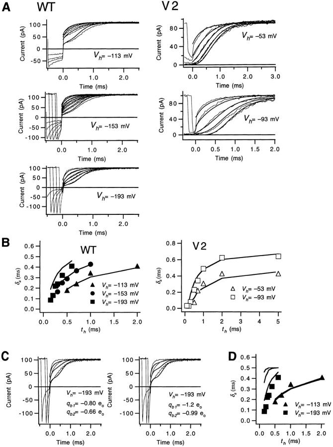 Figure 10. Fits of Scheme 2+2′ to WT and V2 reactivation kinetics. (A) Scheme 2+2′ accounts for WT and V2's reactivation time courses after hyperpolarizations of various amplitudes Vh (between −53 and −193 mV) and duration th. Test voltages were +37 and +67 mV for WT and V2, respectively. All of the displayed data come from the same WT and V2 patch recordings and correspond to the following th values. WT: for Vh = −113 mV, th = 0.5, 0.7, 1, and 2 ms; for Vh = −153 mV, th = 0.1, 0.2, 0.3, 0.4, 0.5, 0.7, and 1 ms; for Vh = −193 mV, th = 0.1, 0.2, 0.3, 0.4, and 0.6 ms. V2: for Vh = −53 mV, th = 0.2, 0.5, 1, 2, and 5 ms; for Vh = −53 mV, th = 0.1, 0.2, 0.5, 1, and 5 ms. In the simulations, for WT, a1 and a2 were each increased by 20% compared with the values in Table II, and the values for βN-1(0) and βN(0) were 520 and 280 s−1. For V2, βN was changed to 1,100 s−1. Data are from patches w448 and v162. (B) Scheme 2+2′ accounts for the delay δa in WT and V2's reactivation time course for different Vh and th. The δa values were derived from the measured and simulated currents from A. (C and D) WT's reactivation time courses were used to place constraints on the sizes of qb1 and qb2. For reactivation time courses measured after Vh = −193 mV, values for qb1 and qb2 that are two or three times as large as the values in Table II predict a reactivation delay that is too long. In D, the three superimposed lines to the left of the squares reflect δa values derived from simulated currents for the qb1 and qb2 values in Table II (the best fit) or qb1 and qb2 values that are two or three times larger. For these simulations, the values of b1(0) and b2(0) were first adjusted to achieve good fits of WT's reactivation time course for Vh = −113 mV (shown by the derived δa values in D). |