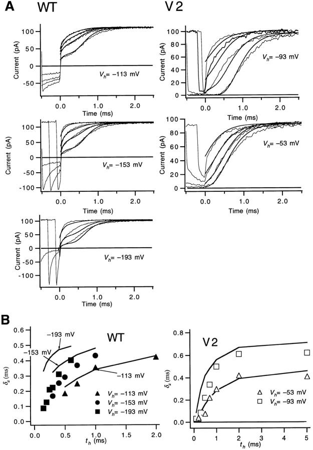Figure 16. Scheme 3+2â² accounts for some but not all of WT's and V2's reactivation time courses. (A) Selected WT and V2 reactivation time courses from Fig. 10 were fitted to Scheme 3+2â². Scheme 3+2â² accounts for the reactivation time courses for the less negative Vh reasonably well, but fails to account for the reactivation time courses for the most negative Vh. In these simulations, for WT, the values of a1, a2, and a3 were each increased by 20% compared with the values in Table III, and the values for βN-1(0) and βN(0) were 520 sâ1 and βN = 280 sâ1. For V2, βN was changed to 1,100 sâ1. (B) The same deviations in the fits are shown in a comparison of the δa values that were derived from the measured and simulated currents in A. These discrepancies reflect the 20% increases in qb1, qb2, and qb3, used to help achieve a sufficiently large total gating charge. |