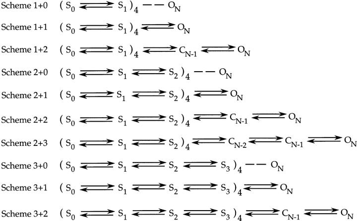 Figure 2. Classes of gating models for Shaker potassium channels. For each model, each of four subunits undergoes one, two, or three transitions between subunit states, designated by S0, S1, etc. In some of the models, the channel undergoes one, two, or three additional concerted transitions. The models are named by the number of subunit transitions and additional concerted transitions. For models with no concerted transitions, the channel is taken to be open after the fourth subunit has undergone the last subunit transition; this is indicated by the dashed line to the open state. |