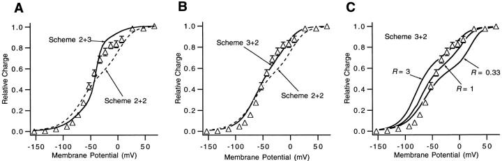 Figure 12. Constraints on how to add more transitions to Scheme 2+2′ were provided by the shape of V2's Q-V relation. (A) V2's mean Q-V relation has been superimposed (solid curve) with predictions of Scheme 2+3′, with the concerted transition in the third to last position having a valence of 3.5. This model steepens the Q-V relation compared with the predictions of Scheme 2+2′ (dashed curve). However, it yields a Q-V relation that is too steep at voltages near −40 mV, while remaining too shallow at hyperpolarized voltages (near −80 mV). For the simulations, the parameter estimates for all but the large valenced transition were fixed to be the same as in Scheme 2+2′; the midpoint voltage of the new transition was varied to best account for V2's Q-V relation. (B) Scheme 3+2′ performs better at steepening V2's Q-V relation across the entire voltage range. For these simulations, the parameter values for S0 ↔ S1 and S1 ↔ S2 were those given for the same transitions in Scheme 2+2′ in Table II. For S2 ↔ S3, we assigned a charge (0.88 e0) that is one-fourth of the charge (3.5 e0) assigned to the concerted transition in Scheme 2+3′ in A. Its midpoint voltage was varied to yield the best fits of the data. (C) V2's Q-V relation was also used to obtain a rough estimate of the equilibrium constant for S2 ↔ S3. Three different simulations of Scheme 3+2′ are shown for different values of a factor R (R = 3, 1, and 0.33) that reflect the ratio of the equilibrium of S2 ↔ S3 versus that of S1 ↔ S2. In these simulations, the charge associated with S2 ↔ S3 was assigned to be the same as that associated with S1 ↔ S2, given in Table II. |
