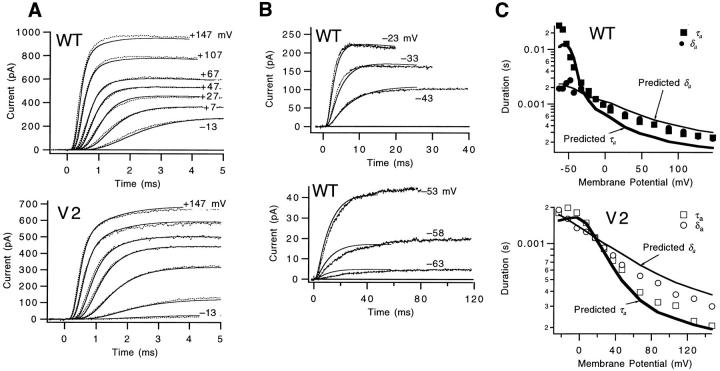 Figure 1. Patch-to-patch variabilities are apparent in WT and V2 voltage dependence of Po (A) and ionic current time courses (B). The Po-V plots were taken from two different patches each for WT and V2, and time courses were taken from seven different patches. The test voltages for the currents in B were −13 and +27 mV for WT and V2, respectively. (C) A comparison of the τa values at different test voltages from two WT and V2 patches shows that the variability in the current kinetics is well accounted for by a simple voltage shift. |